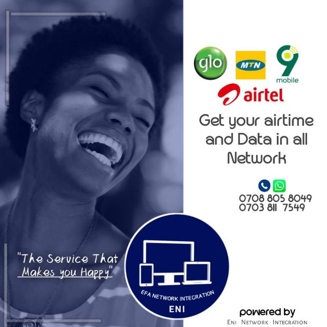 Welcome to Efa Network Integration. Efa Network Integration (ENI) is a prospective company of an Integrated network system. ENI engages in the sales of Recharge card and data of all networks in Nigeria with tips of getting more value for your consumption. ENI also prints recharge card and sells both retail and wholesale. It offers assistance for online telecommunication business start-up (of massive returns) with a commission as low as NGN 2000.