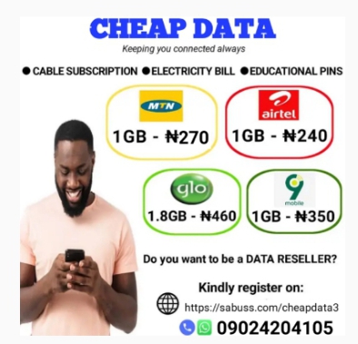 Welcome to Cheap Data, We offer instant recharge of Airtime, Databundle, CableTV (DStv, GOtv & Startimes), Electricity Bill Payment and more. We're Fast Automated Services 100% Secured We're Reliable Always Online 24/7 Customer Support